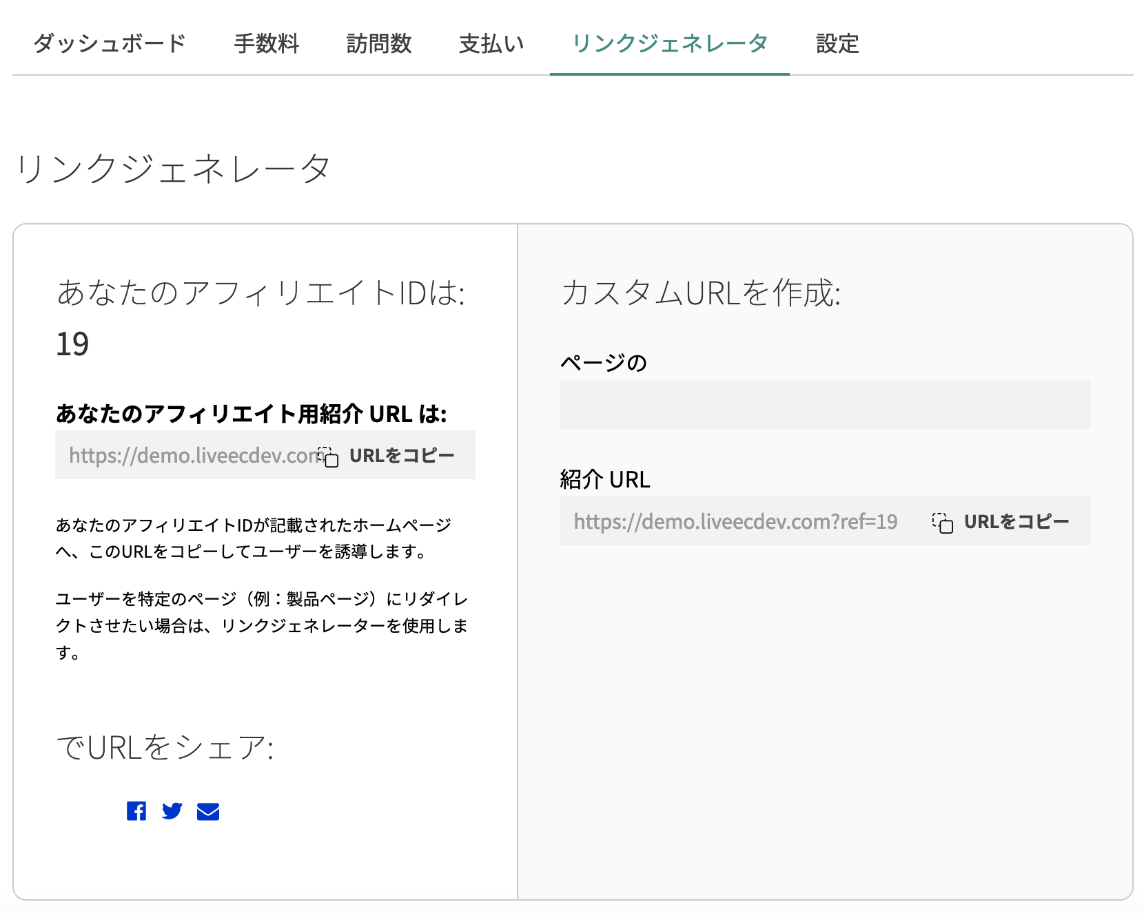 アフィリエイト販売を行うには、専用のリンクジェネレータを使用します。